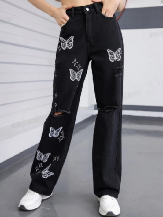 Butterfly Printing Denim Trousers Women Holes Jeans Straight Pants High Waist