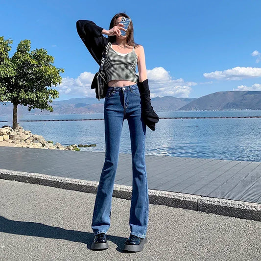 Women's Jeans Blue Flared Female Denim Pants with Pockets Bell Bottom