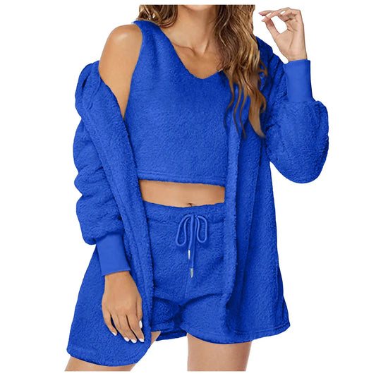 3 Piece Plush Shorts Set Causal Womens Outfit