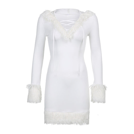 Fur Trim Hooded White Vestidos Women Long Sleeve Mini Bodycon Dress