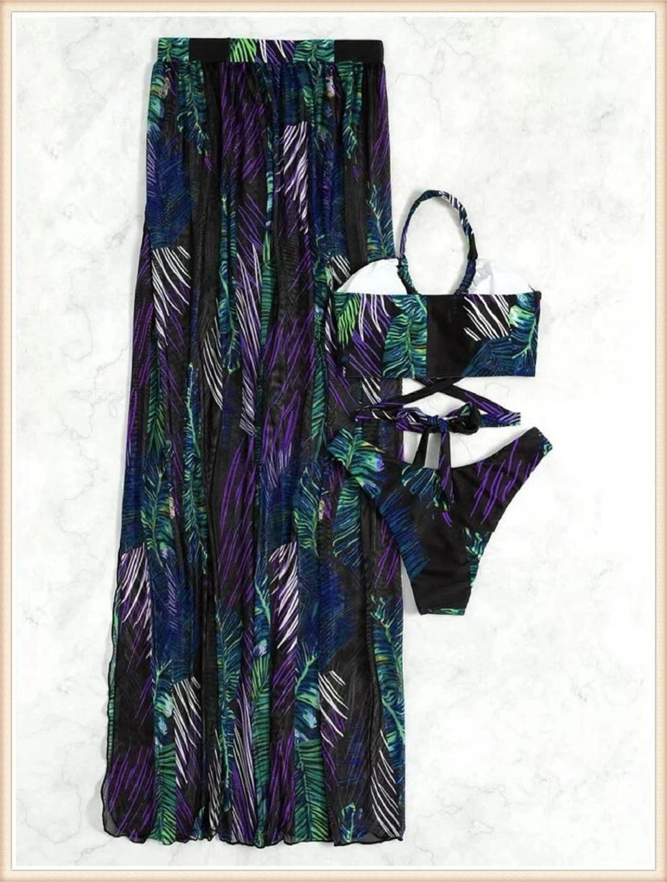 A 3-Piece Tie-Dye Cross Bikini Swimsuit with Cover-Up Pants is a vibrant and versatile beachwear ensemble that combines style and functionality. Here's an overview: