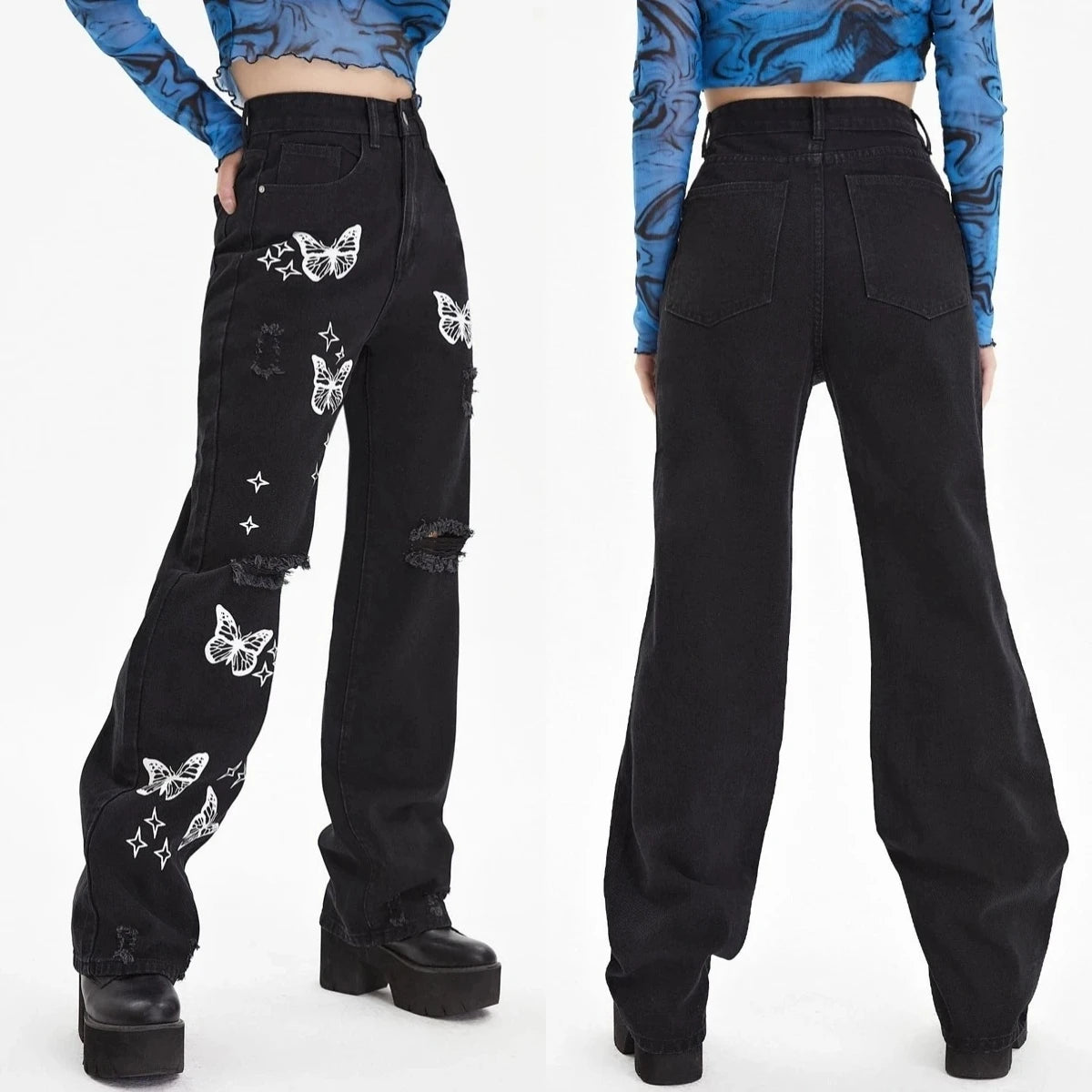 Step up your denim game with the High Waist Ripped Butterfly Print Jeans—a must-have for fashion-forward women! 🦋👖✨