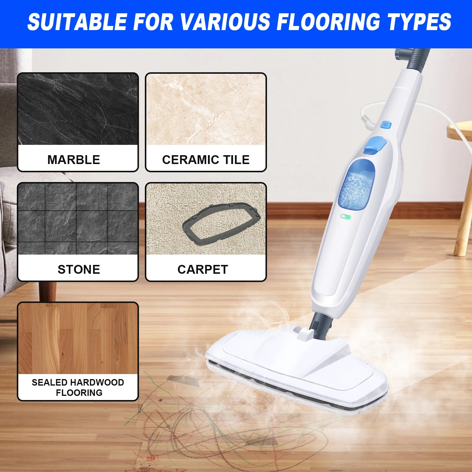 Perfect for hardwood, tile, laminate, vinyl, marble, and carpets, this powerful steam cleaner is ideal for a deep, chemical-free clean.