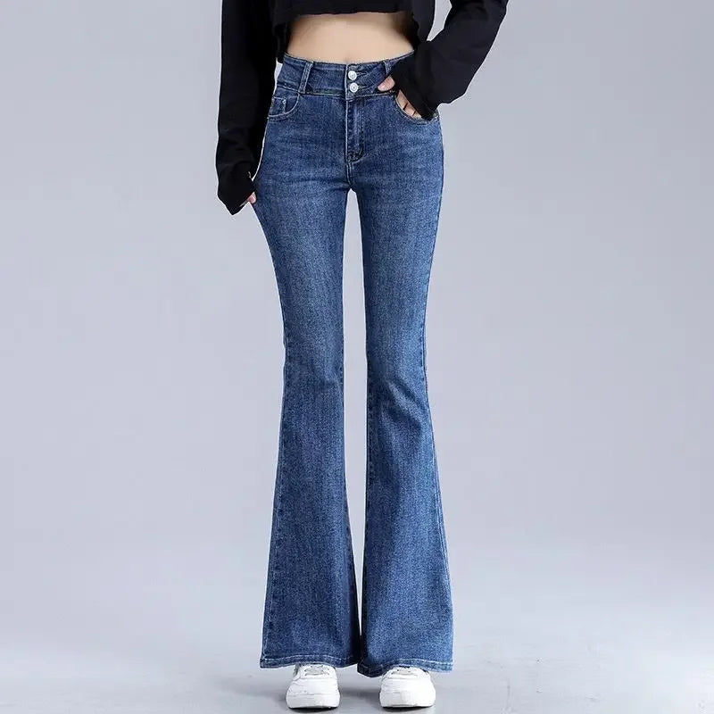 Women's Jeans Blue Flared Female Denim Pants with Pockets Bell Bottom
